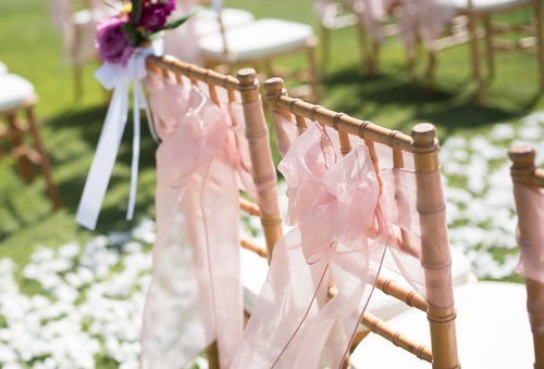 リゾートウェディングには定番のアーチ、チェアには風になびくリボンを飾りつけたアイディア
